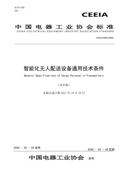 范围:该文件规定了智能化无人配送设备的术语和定义、产品分类、试验条件、检验规则、安全、性能、电磁兼容、环境适应性、智能化、关键零部件的技术要求、标志/说明/包装/运输/存储和结果报告;适用于在道路或公共空间使用的,由电力驱动的轮式智能化无人配送设备(Cargo PeTs);不适用无人机;不适用于既载人又载物的电气运输设备。
