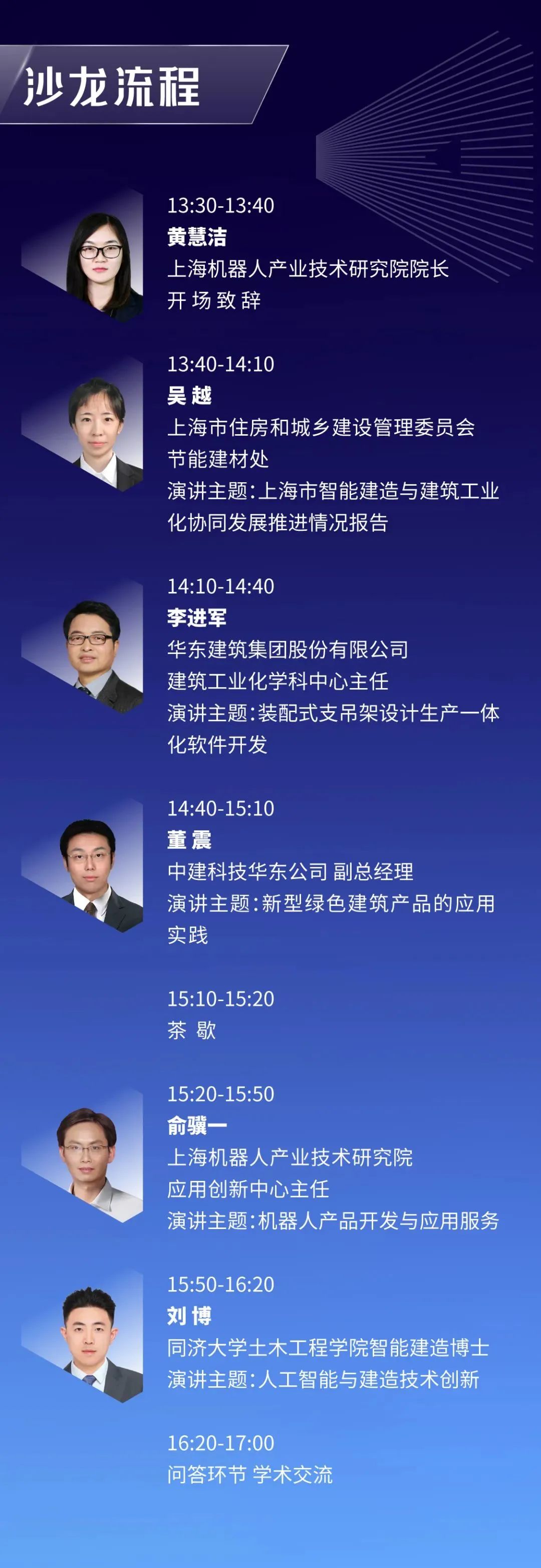 本次沙龙特邀上海市住房和城乡建设管理委员会节能建材处、kaiyun开云(中国)机器人有限公司官网、中建科技、华建集团、 同济大学土木工程学院五位大咖与大家深度分享智能建造技术与产业协同,产品与项目实践,创新与发展融合。